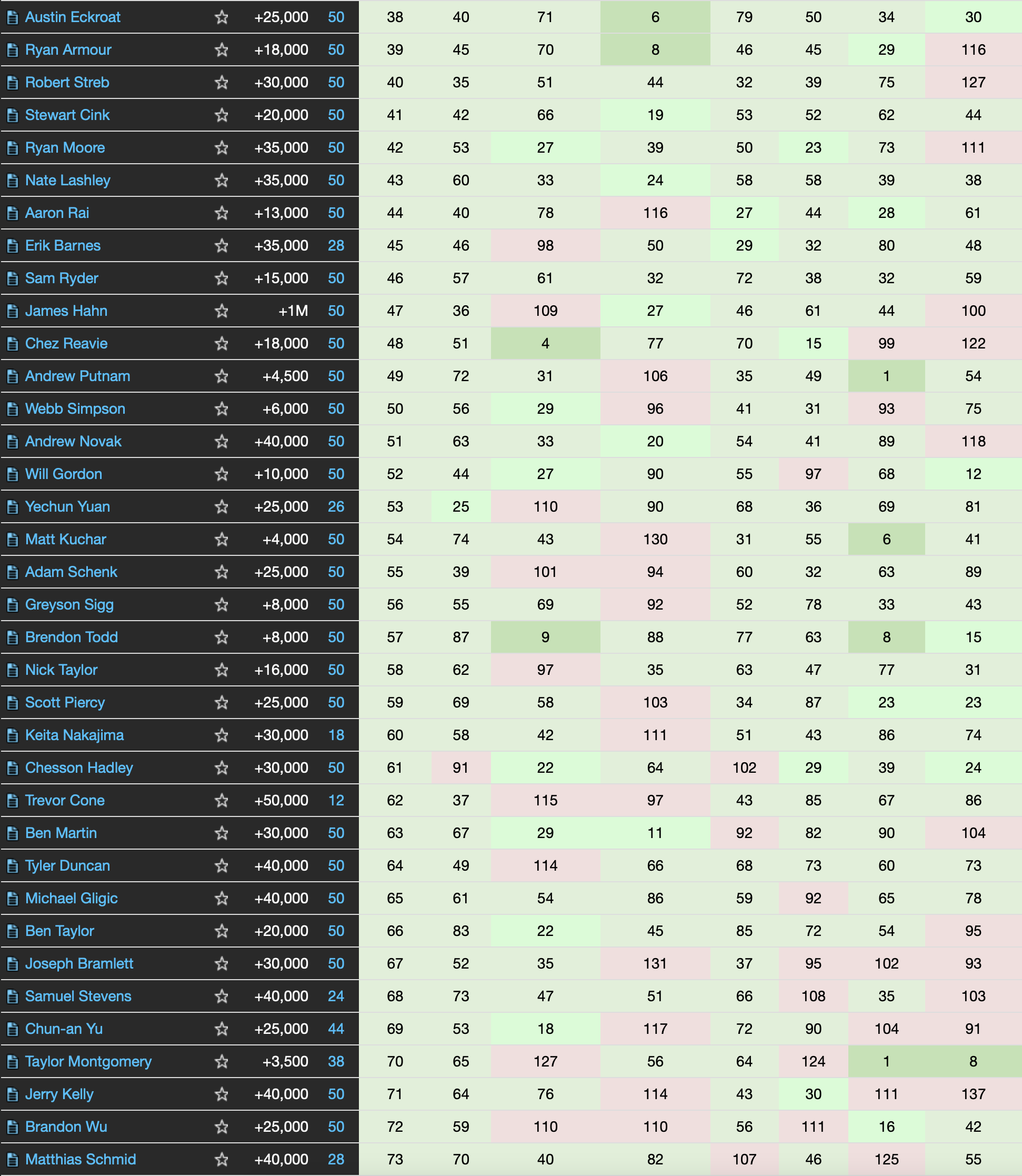 Full field event with a cut! T65 and ties now. Love it. The course is short (7044 yards) and fairly open. This is a second shot course by far. We hit the winner four years ago at 40-1 (Kuchar). Three years ago we had Palmer at 90 to 1 and I touted it as my favorite play of the week. He ended up coming 4th. Remember he hit a wood out of the bunker on a par 5? Two years ago we had Webb, Niemann, Kirk, and Berger who all came top 10 but Kevin Na ran away with it. Last year we leaned on ball strikers and Hideki (dope ball striker) won but we weren’t on him. Really looking at stormy Georgie for this. Last year was windy and rainy and gross . When weather is normal this is another scoring course but wind can play a factor for sure. JT shot 59 here a few years back and crushed the field..